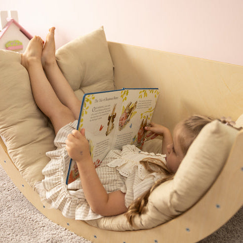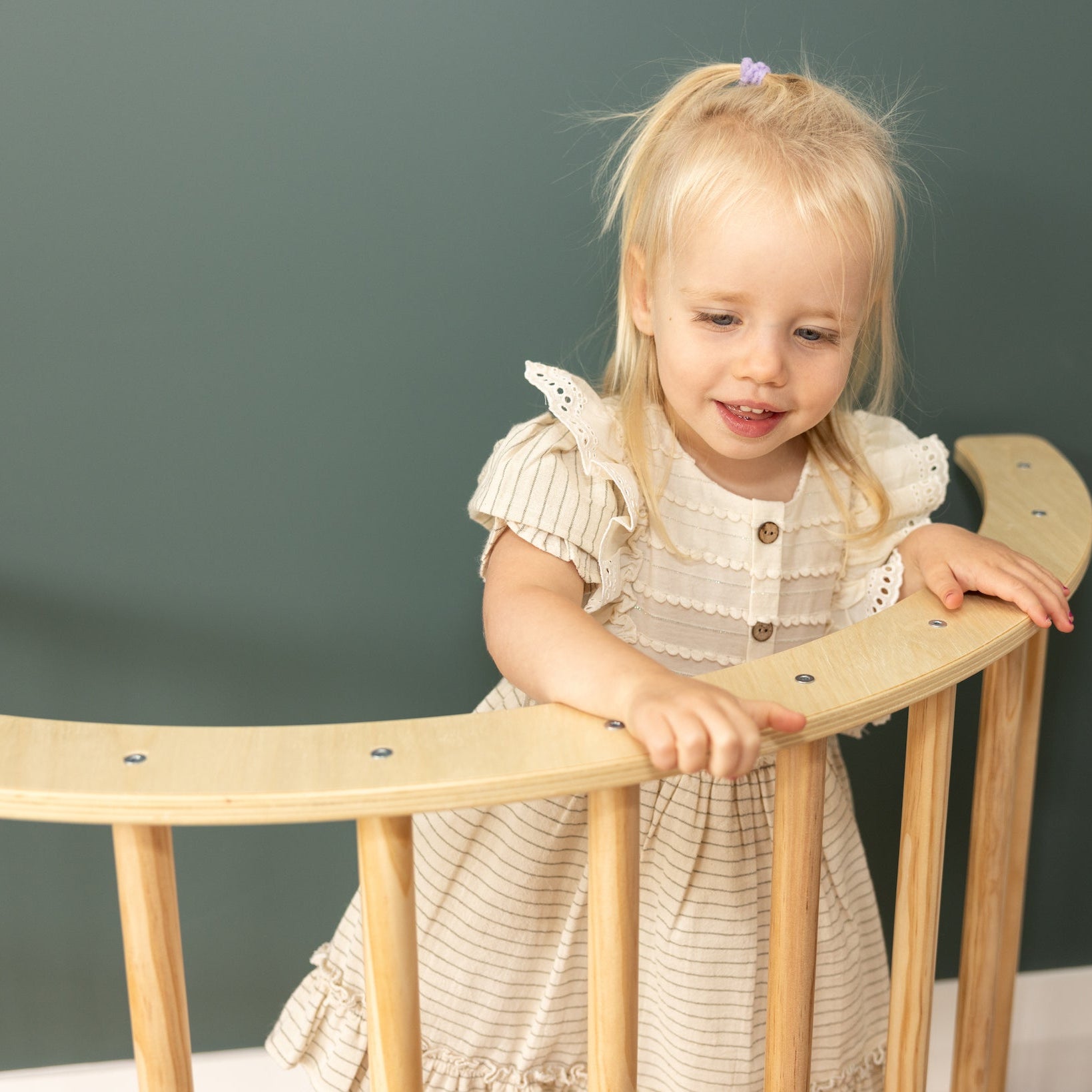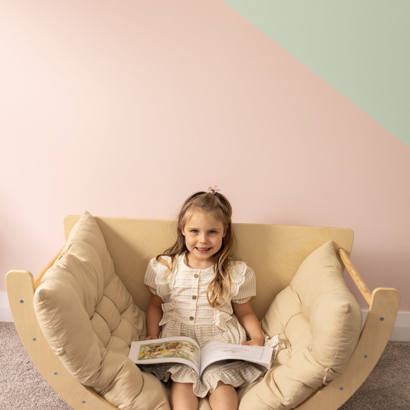 Create a beautiful indoor play setup with our Multi-use Climbing Arch + cushion. From a cosy, supervised baby gym in the early months to a sturdy climbing arch for bigger kids, this versatile Montessori piece invites rocking and climbing that build core and upper-body strength, balance, agility and coordination. It is ideal indoor play equipment for screen-free, open-ended play that grows with your child.