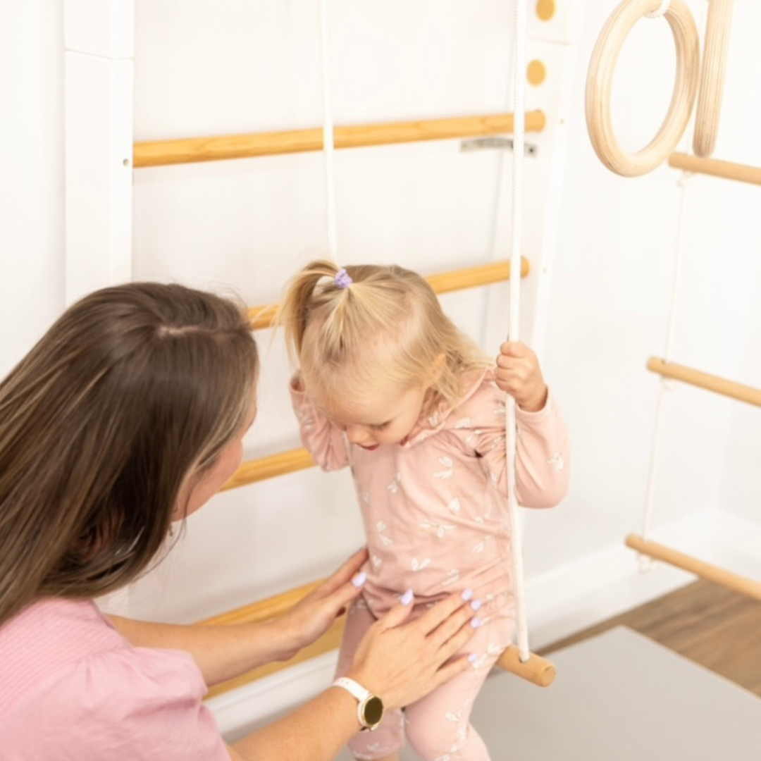 Simple fun that keeps bodies moving. The Wooden Swing/Trapeze clips to your Topsy Turvy Swedish Ladder to create a compact indoor jungle gym that builds grip strength, core stability, balance and confidence. It is a favourite Swedish Ladder accessory for screen-free play and pairs beautifully with gymnastics rings, rope ladder and slide to create a full indoor play equipment setup at home.